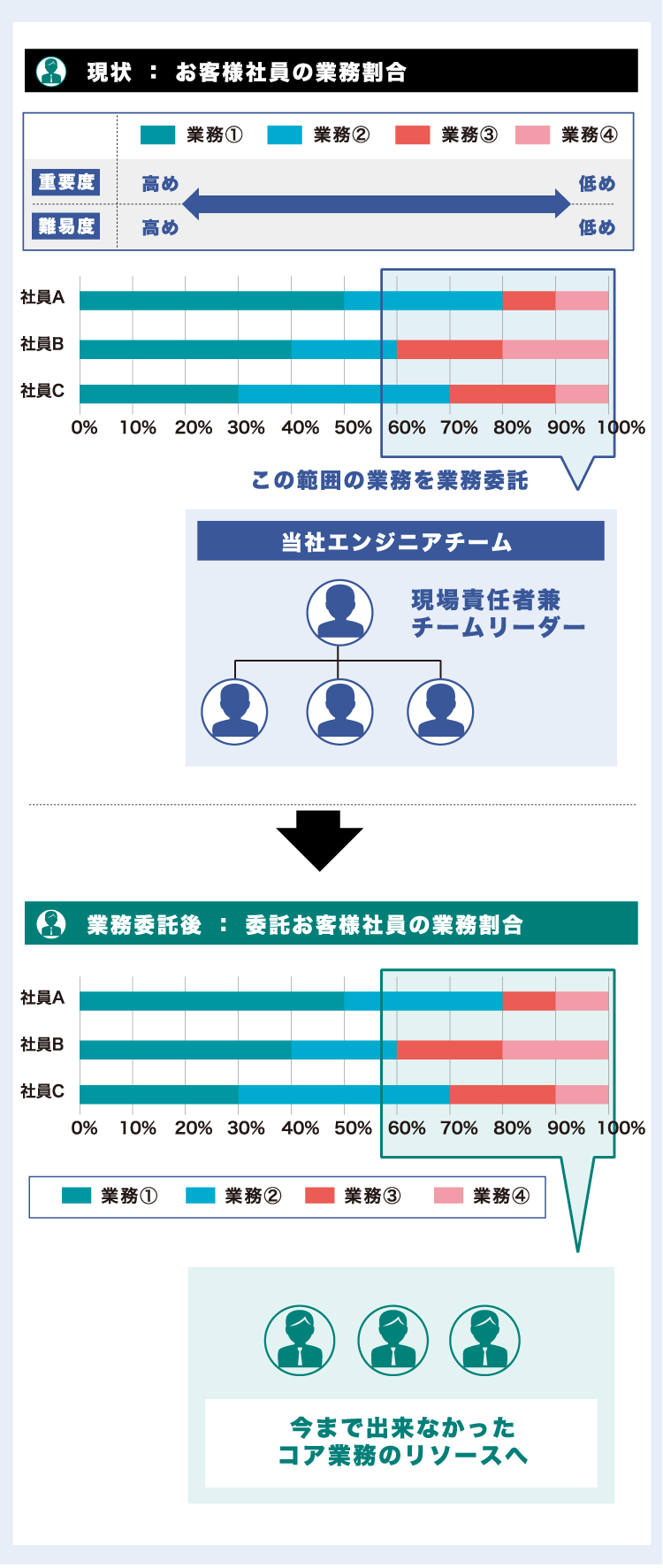 お客様構内にて、業務に精通したエンジニアを現場責任者兼チームリーダーとし、数名のチームとして業務を行います。又、当社エンジニアへの教育・管理も当社で行います。